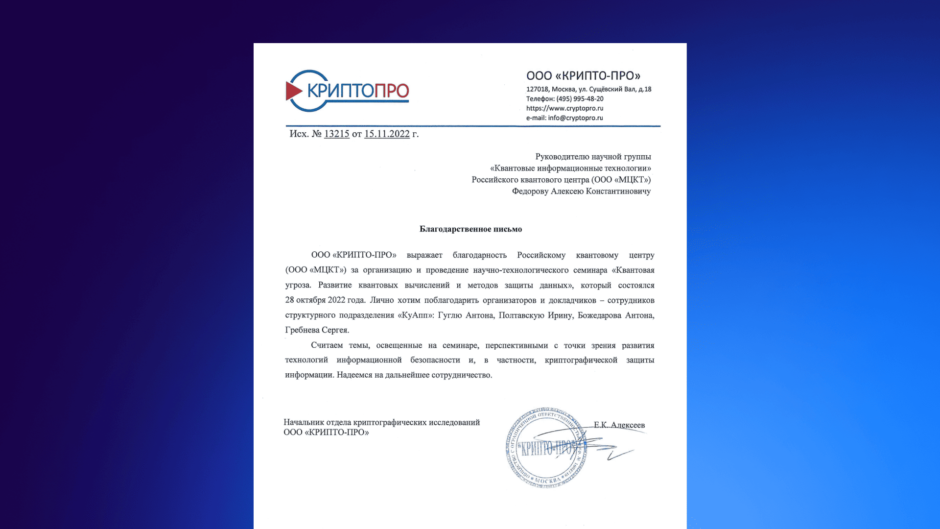 КРИПТОПРО благодарственное письмо 2022