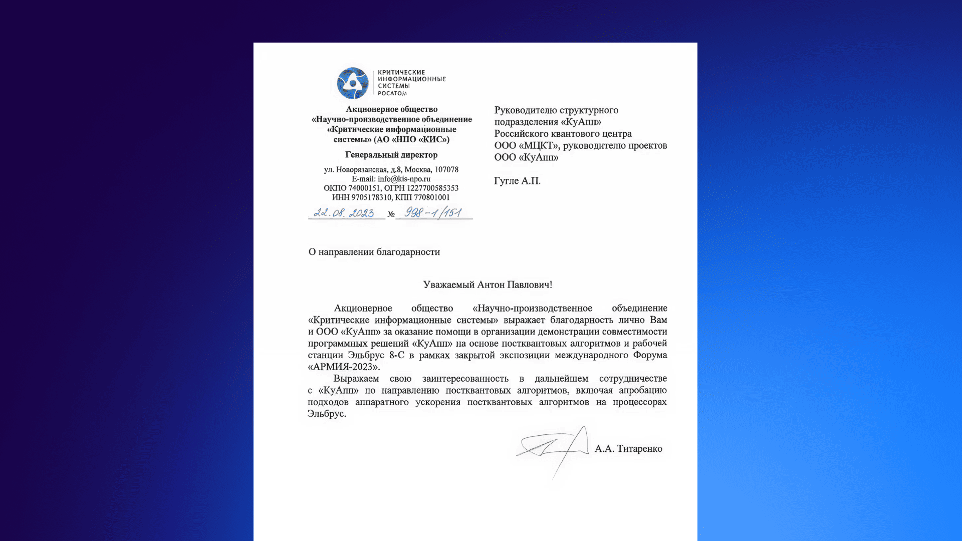 Критические информационные системы РОСАТОМ благодарственное письмо 2023