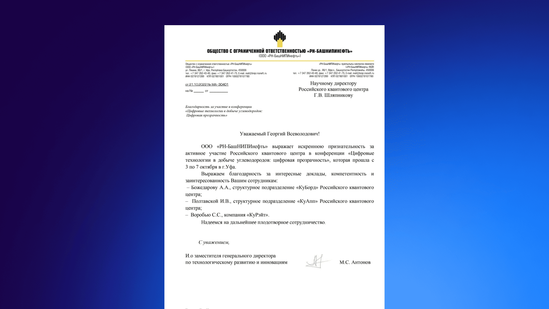 РН-БАШНИПИНЕФТЬ благодарственное письмо 2022