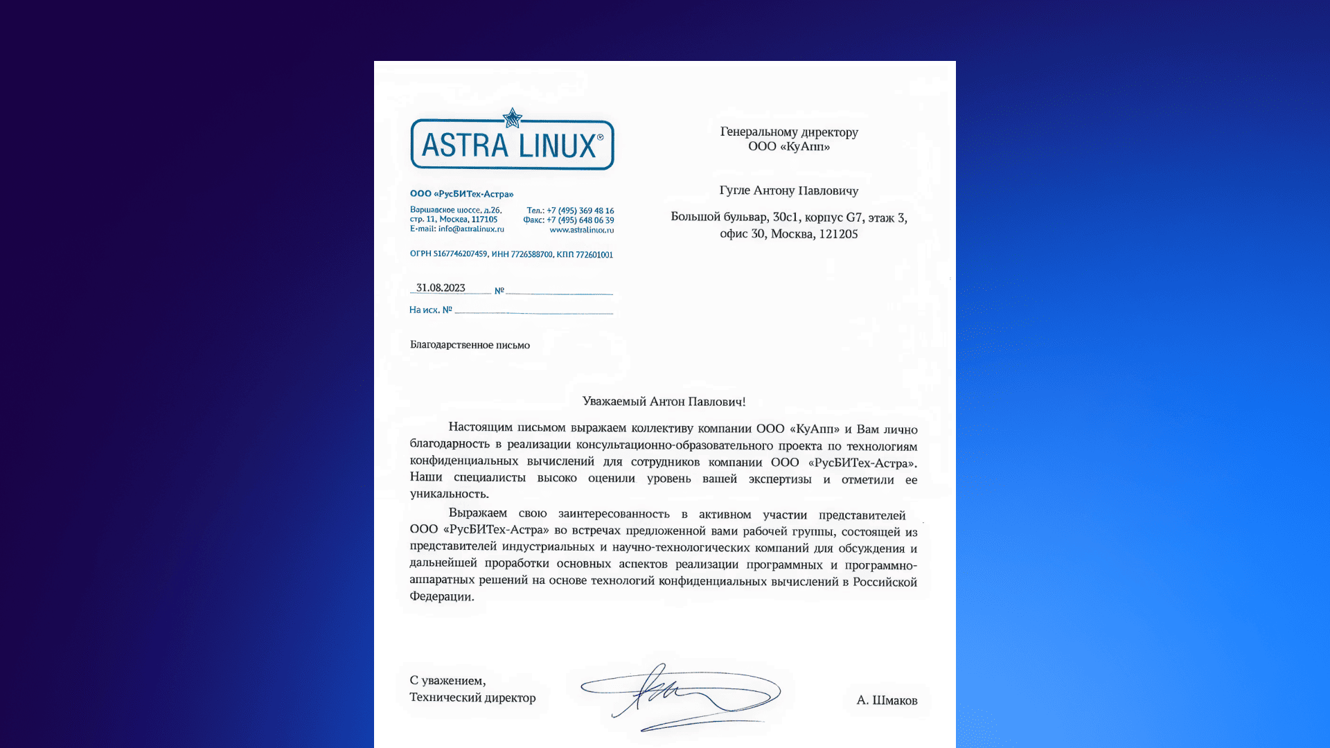 Астра Линукс благодарственное письмо 2023